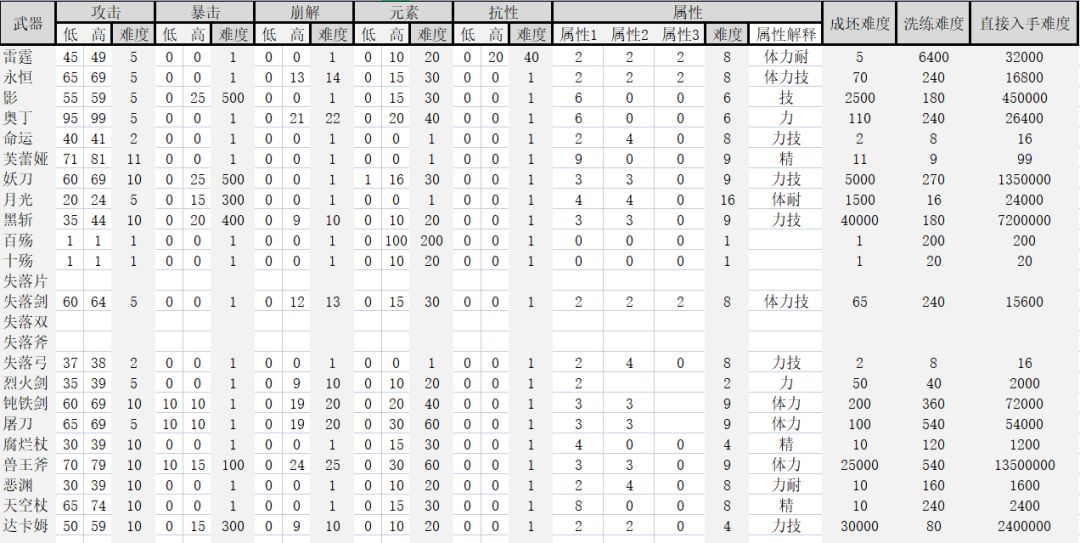 PS: 1. 数据的最高和最低值表示可能会在面板上显示的数据范围。 2.难度表示武器面板数据存在多少种可能性,难度的倒数则表示满配武器的入手概率。成坯难度表示不可洗练部分满配的难度,洗练难度表示可洗练部分属性的满配难度。 3. 若需要补充或提供其他武器数据,欢迎在评论区留言,也欢迎勘误。