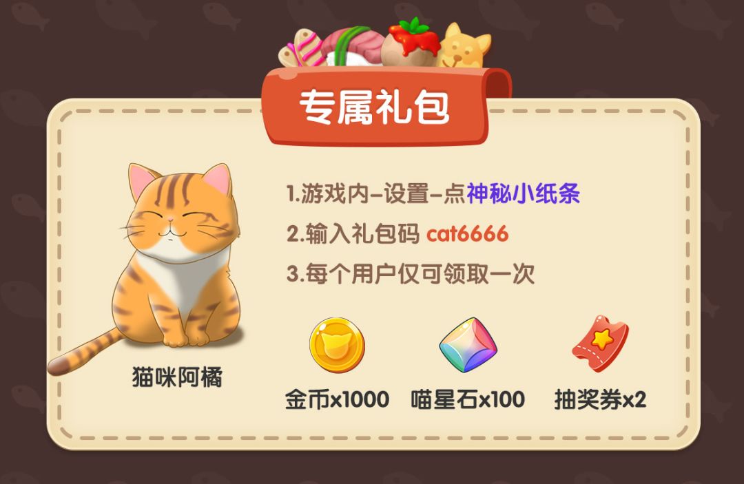 为各位铲屎官准备了一份新手礼包,请笑纳。 礼包内容:猫咪“阿橘” 金币*1000 喵星石*100 抽奖券*2 礼包码:cat6666 领取方法:游戏内-设置-小纸条 输入礼包码cat6666