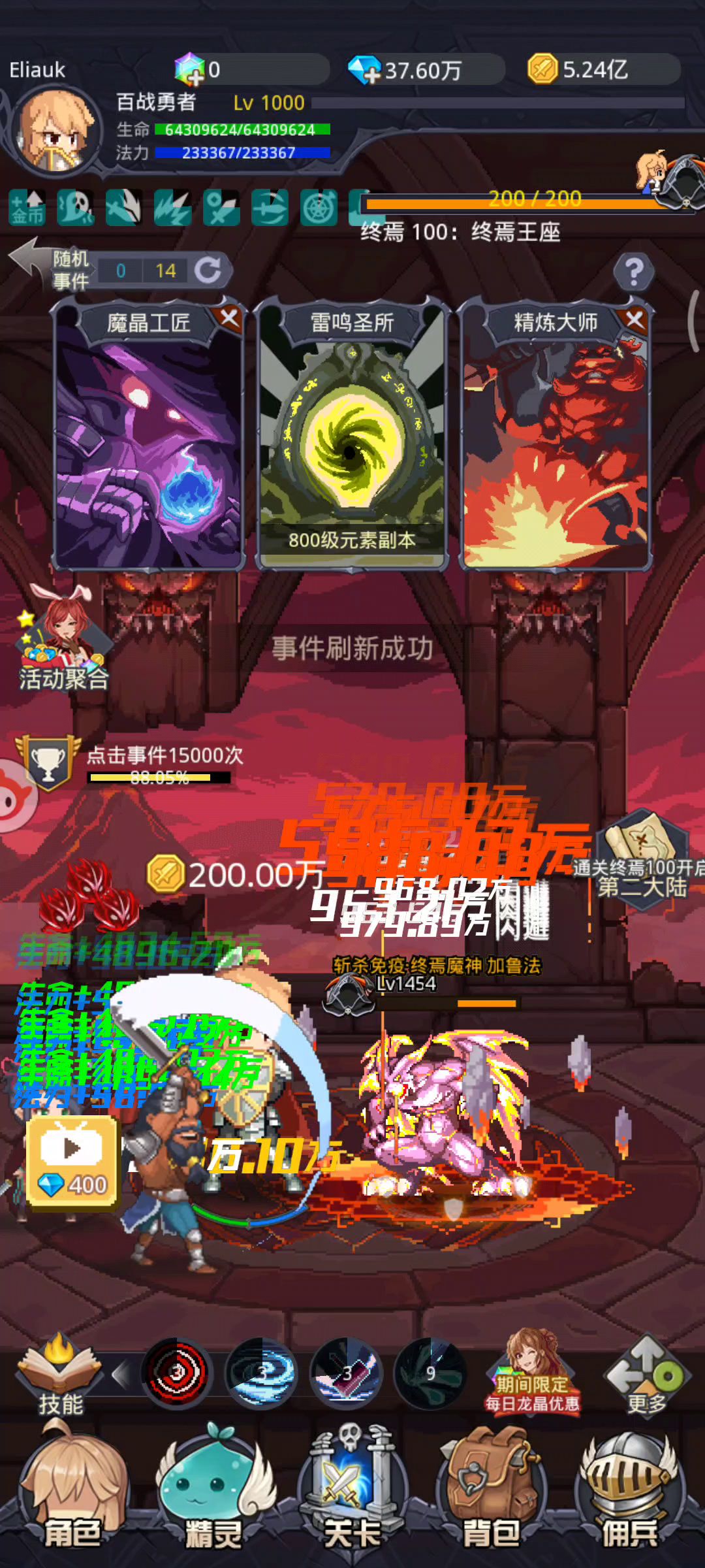 跟攻略记录:第一天到噩梦33,全装备400套,精灵迅,血,功一级宝宝到100级,等级600。第二天地狱11,全装备600套圣银,三个一级血宝100级,三星狭义,一星雷霆,一星永冬,二星霜源,暂时卡关了,四个攻略说的技能都升满了,有三条龙了,明天继续更新