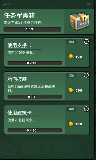 游戏更新后,您可以在游戏主页右上角看到一个军需箱图标,这就是我们的每日任务入口啦。 在每日任务里,每日您最多能完成三个任务,完成的任务将会在次日8:00更新哦。完成对应的任务,即可领取对应任务的奖励哦。比如下图,您可以点击完成任务,获得200金币。 您完成的任务将会累积起来,累计完成3个任务后就可以打开任务军需箱了哦。如果您每日的任务均完成,那么每天都可以开启一个任务军需箱哦。而且任务军需箱可