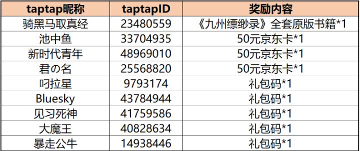 原活动地址:恭喜以下城主获得精美奖励,请您添加《九州缥缈录》官方客服QQ:565916463后,领取,并且备注“tap论坛晒阵容活动奖励”。
