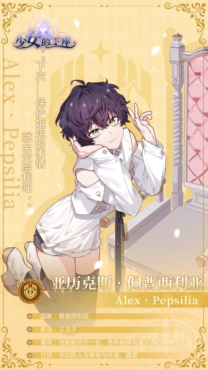 三王子亚历克斯,是天真活泼的小小少年,也是对你充满着依恋之情的可爱弟弟。不为人知的“特殊能力”背后,隐藏着他层层重重的身世之谜。面对佩普西利亚家族突如其来的灾难、与接踵而至的困境,这位少年也决意加快成长的步伐……“真希望自己可以快点长大,下次……保护姐姐的事情就交给我吧。”================================官方QQ群:805258564官方微信:少女的
