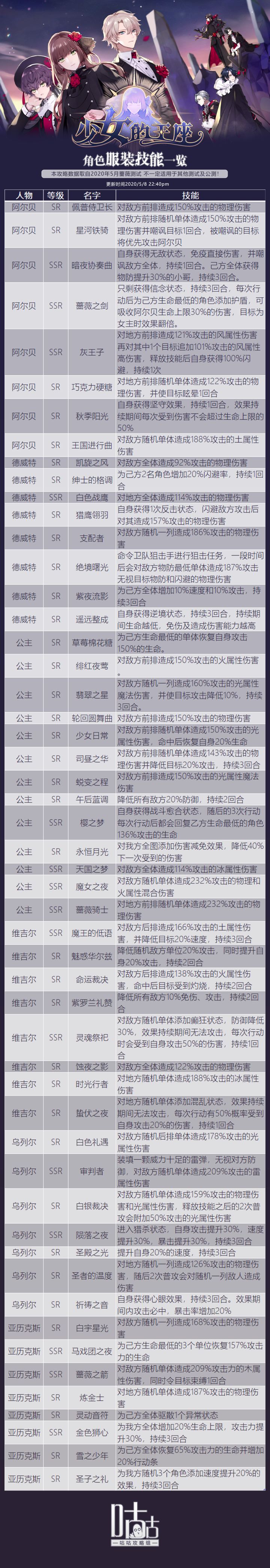 仅统计SR及SSR及服装技能。大致感觉是女主全能,阿尔贝T和输出,亚历克斯治疗和正面BUFF,德威特花式霸道群攻,乌列尔一颗子弹爆头(单体很强)和维吉尔暗戳戳放DEBUFF……吧。@