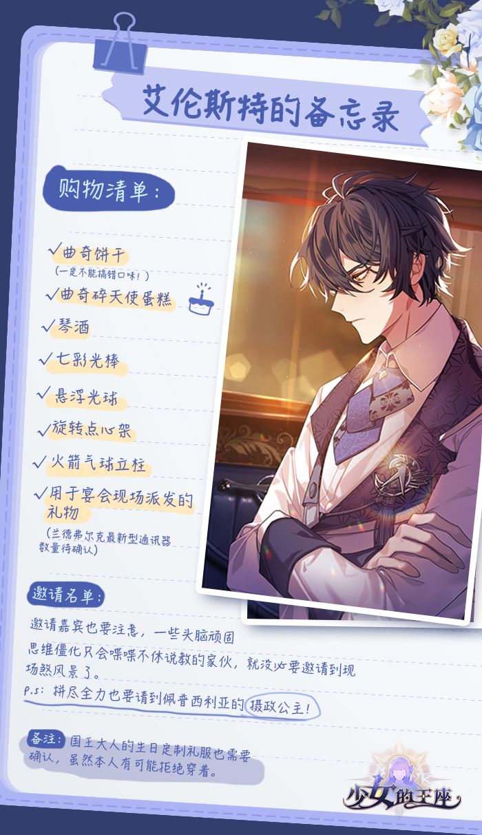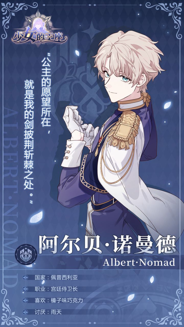 年轻的侍卫长,恪守规则温和守礼,研习剑术的同时,却意外地喜欢制作甜品。持剑之手,可以为您披荆斩棘,也能准确地调和好冰淇淋的甜度。“您问我的个人安排?其实也有的……下午我想去练习剑术。”“不过如果公主希望我陪伴的话,我会另外安排练习的时间。”================================官方QQ群:805258564官方微信:少女的王座(sndwzsy)官方微博:@