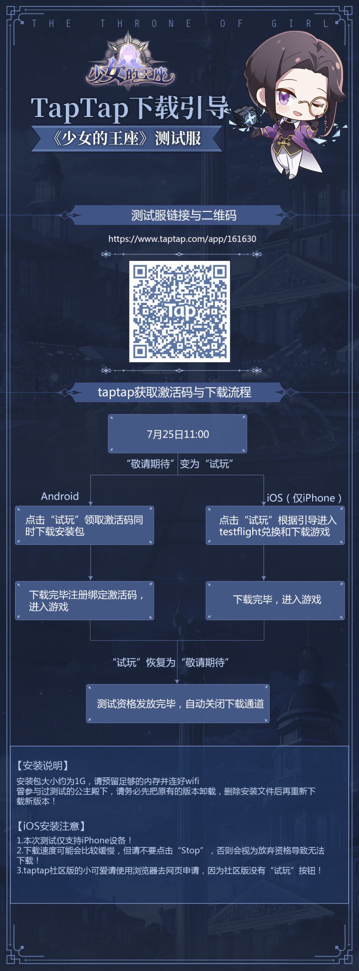 亲爱的公主殿下,久等啦(´,,•ω•,,‘)~非常感谢大家耐心的等待!《少女的王座》7日盛夏测试将于7月25日11点开启!这次是安卓和iOS都拥有姓名的不计费删档测试哦~为了提供最好的游戏体验,本次为限号测试,本渠道限量名额为安卓1500,iOS 500,先到先得!详情如下: ※参与测试请前往哦!============重要!测试说明===========【测试时间】7月25日11:00~8