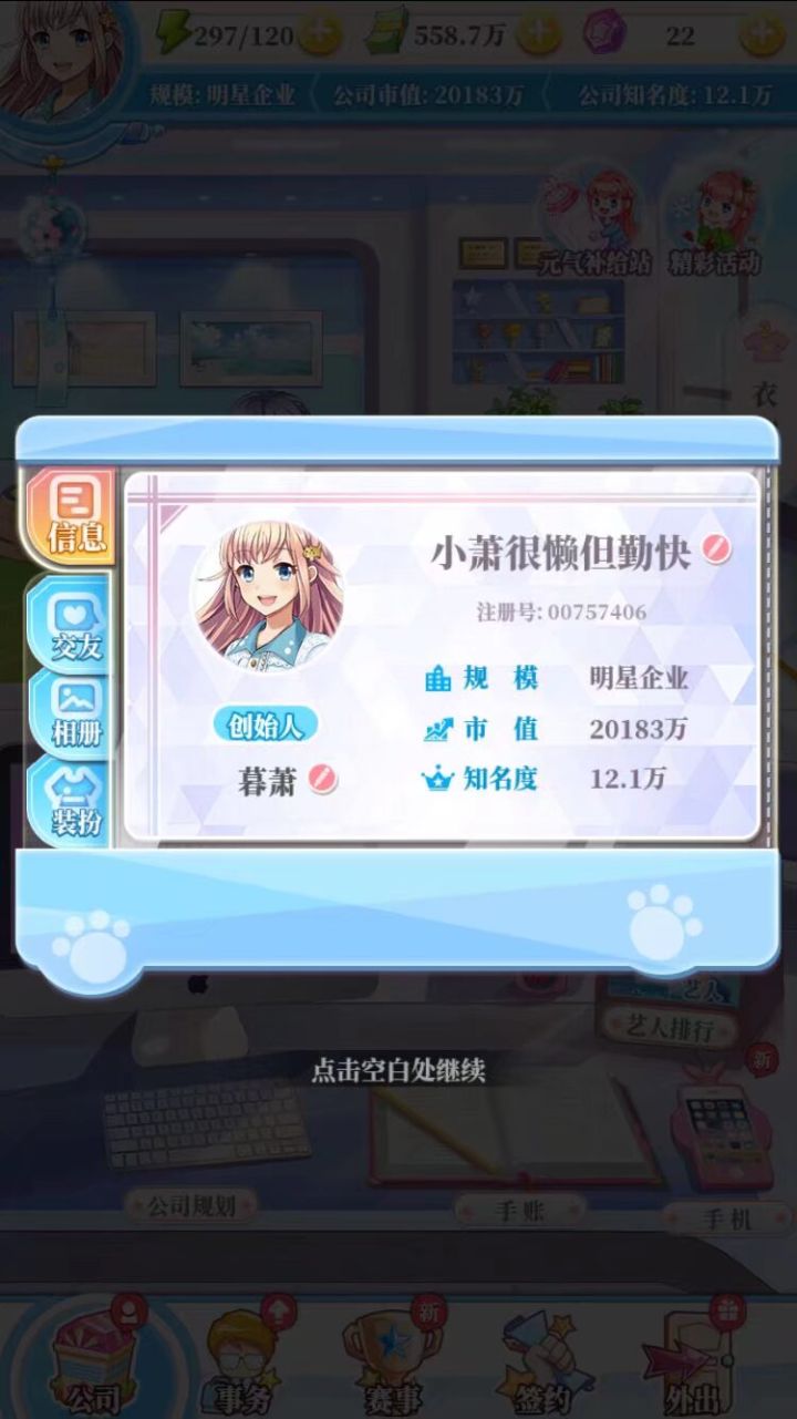 6、很多小细节问题:我虽然是糙汉但是女朋友是饭圈人士,看我玩游戏的时候给了许多建议。比如首先,苏然口口声声要做一个带给粉丝温暖的公司,却频频把应援粉丝叫做推销员,艺人对于粉丝的态度也不够好,我觉得这是不符合人设的,需要策划文案优化。 还有就是现在饭圈的整体情况女粉比男粉多很多,且粉丝也多是异性粉,应援经常出现男粉丝应援男明星确实不够真实,应该整体女粉偏多,然后总体上男粉给女明星应援,女粉丝给男粉丝应援这样,肯定有例外但比例不应该这么高。另外:我觉得“宅男胖子”这个称呼很不友好