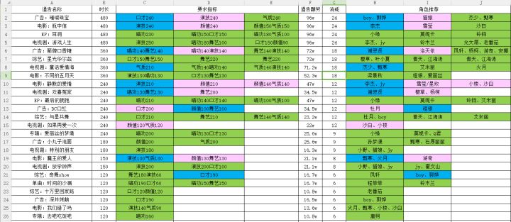作为一个懒破天际的人,在明星待了3个多月就希望等有dalao发一下娱乐集团的通告属性好针对性培训一下。结果。。。这么长时间也没人发,只好自己强行升了集团,发现真的属性要求和明星差别真的大,弄了2天应该是弄完了全部的。在这个过程中确实有属性不满也有正常发挥,有的还是超常(通告暗改了?)模板套用以前的奈飞天大佬的表格(感谢奈飞天大佬以前为我指路,现在别懒了,多写攻略啊喂)后面的艺人推荐是我自己的。另