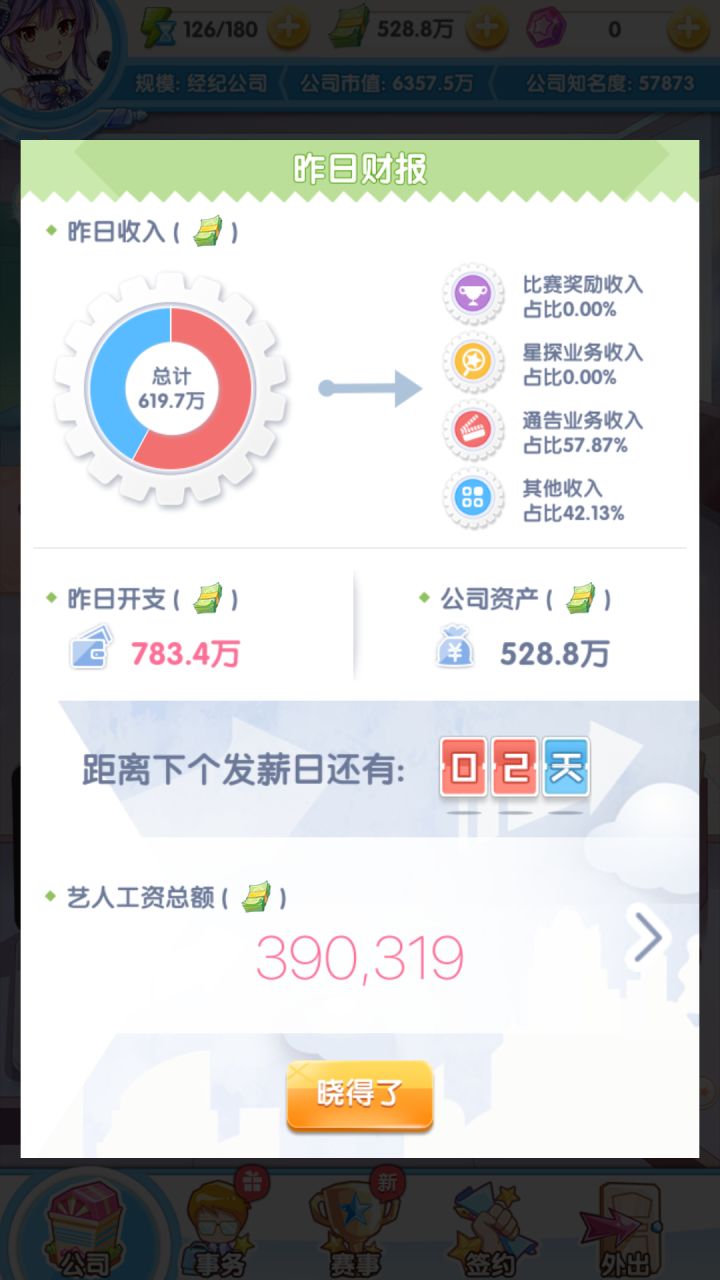目前处于经济公司。注册号:00625809赚钱的项目有:通告,商演,比赛,明星挑战赛,探宝,分享会,刮刮乐,元气股市。①通告有资质要求,达到高的那项就有可能出“表现很棒”或者“正常水平”,只达到低的就可能“糟糕或者崩溃”,时间长的最好是晚上接了,这样白天就可以培训打比赛了。②比赛需要的执行力多,但是也很赚钱,但是后期经常会过不去,需要培训 所以说赚钱不是很快,但是也一定要打啦。③明星挑战赛