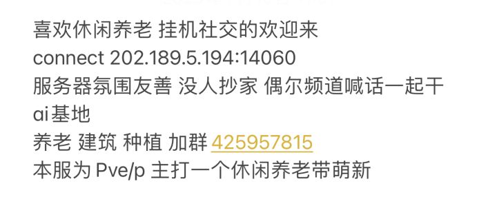 5倍【PVE】萌新首选-休闲养老|4年公益老服|喜欢玩pve 慢节奏 建造 种植 养家的活跃玩家 欢迎光临公益4年的老服,无权无vip这是底线,不用质疑直连connect 202.189.5.194:14060服务器清档时间:月清 随官清