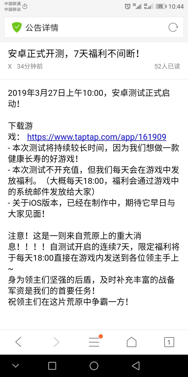 2019年3月27日上午10:00,安卓测试正式启动! 下载游戏:https://www.taptap.com/app/161909 - 本次测试将持续较长时间,因为我们想做一款健康长寿的好游戏! - 本次测试不开充值,但我们每天会在游戏中发放福利。(大概每天18:00,福利会通过游戏中的系统邮件发放给大家) - 关于iOS版本,已经在制作中,期待它早日与大家见面! 注意!这是一则来自荒原上的