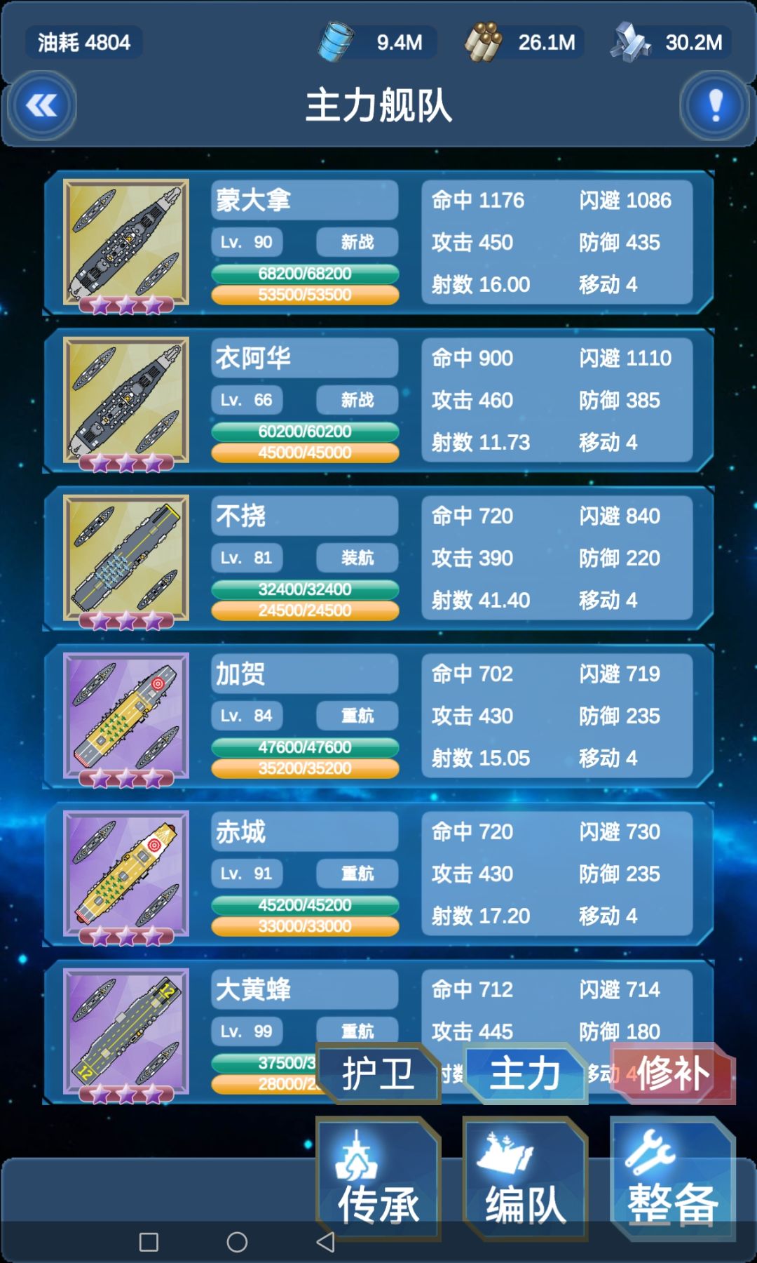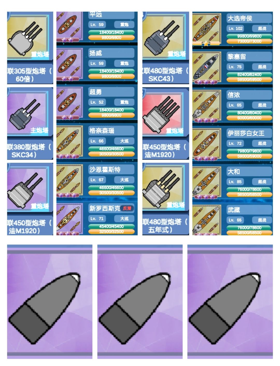 很久没有更一图流了,今天它来啦! 图中是我真实存在的队伍。 三艘平远级如图…… 两艘沙恩级则用了俾斯麦同款380(原装) 至于新罗西斯克,我给了450mm法系炮,达到了455攻击。 因没搞齐超战,主力杂乱。除后四艘超战都带的R系3联480炮且女王带了超重弹头,别的主炮没改。 虽说我没打过,但强度还是可以的,当然娱乐性大于实用性,巨舰大炮主义者狂喜嘛~
