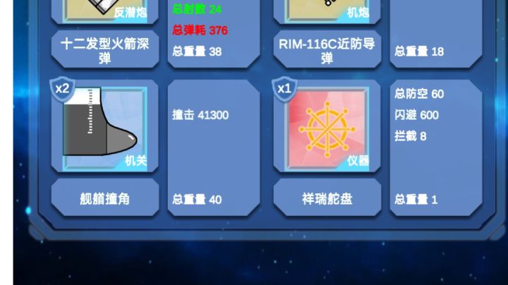先上图吧这是舰队配置,为了彰显撞角的实力,只上护卫舰就可以了,主力留家里撞角的威力应该是和血量成正比的,所以4个庄严级航母是关键,血量上8万后,单个撞角伤害至少3w以上。搭载到闪避最高的护卫舰上。装备优选选择高拦截,高闪避,高防空的,主武器无所谓,反正弹药支撑不到第二发。实操一把,只上护卫舰队就够了不用管队形,3000左右的闪避加拦截,冲锋就是了,集火也不怕。主炮基本就够打一发的,弹尽后就