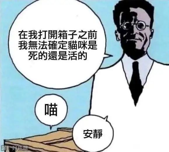 一个箱子里关着鸽子和它泡澡的锅,有50%的概率鸽子会被炖成鸽子汤从而导致元帅咕咕咕,因此在打开箱子之前元帅处于咕与不咕的叠加态,我称之为..........“咕咕咕~”“哦,元帅咕了”