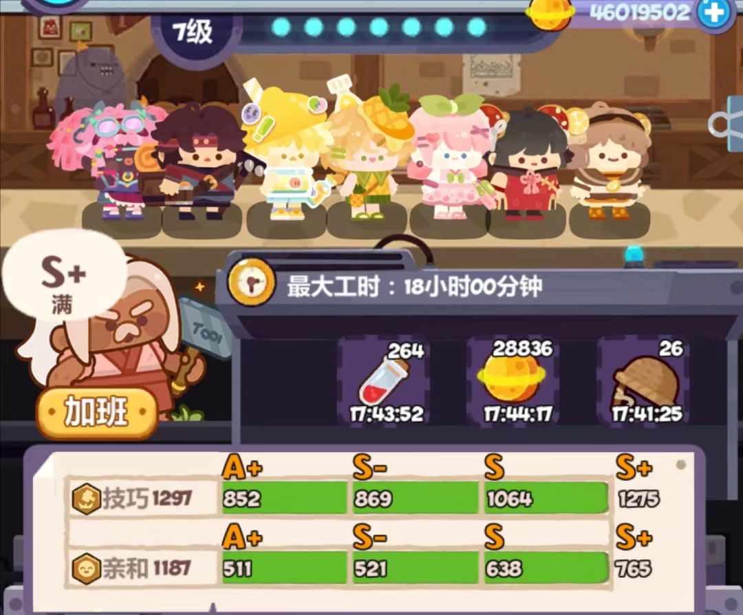 超市打工仔以亲和为主力量为辅,值得一提的是要到达同样的评级,超市所需要的属性要比道具店高,比如道具店S级需要技巧值1064,而超市A级就已经需要亲和值1155,要到达A+则需要亲和值1404,换言之7个打工仔平均每个要提供200+的亲和值。 前期搭配:挑道具店剩下来的用,比较好的有骨头兵,小红豆,石像人默艾。 提升超市人口后,可以考虑村长夫妇再就业+力量达人(城镇卫兵,铁匠,旅行商) 微笑女神自带