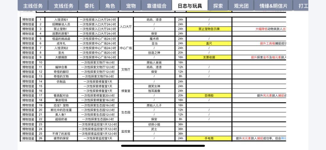 给妹妹亲手整理的攻略!她不太会用Excel😐 索性发上来吧👾 小程序工具是可以看到日志+玩具详情的,这份是简略版,方便补日志🤧 补充: 【以下文字版‼️】 💚冒险星玩具💚 ❶茶杯: 一次性探索大沼泽8小时 ❷牧师的日记: 牧师;一次性探索魔王城堡10小时 ❸配音演员的CD: 配音演员;一次性探索藏宝库8小时 ❹扑克: 一次性探索魔王城堡8小时 ❺泥潭的罚款单: 一次性探索大沼泽4小时 ❻鱼竿: 一