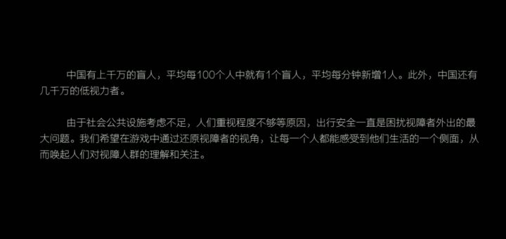 我国曾在上世纪80年代进行过视力残疾状况调查。结果显示,我国有视力残疾患者近1300万,其中盲人约550万,低视力约750万。14岁以下儿童盲及低视力的主要病因为先天性遗传性眼病,60岁以上老年人盲或低视力的主要病因为白内障。我国每年会出现新盲人大约45万,低视力135万,即约每分钟就会出现1个盲人,3个低视力患者。“见”这款游戏则就是讲述的一个盲人的爱情故事。玩家需要扮演一位视障的钢琴手,当