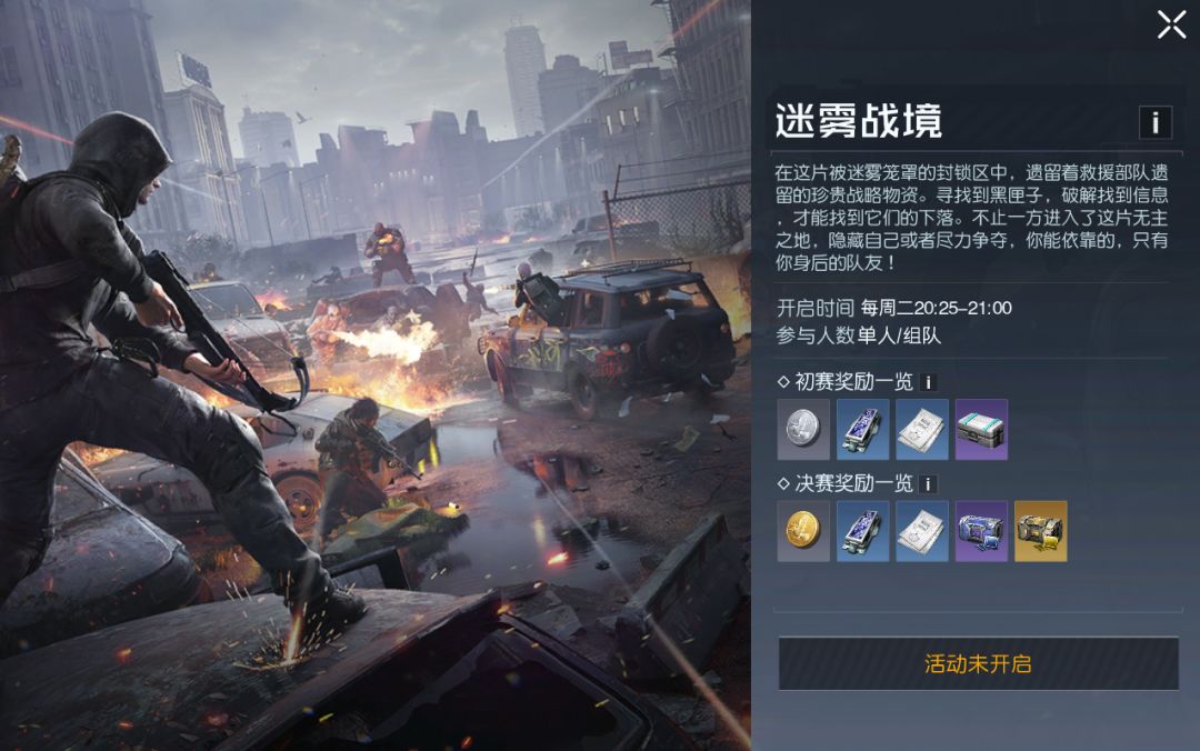 在每周二晚间8点25至9点,达到35级的幸存者们可以组成2-4人小队或单人报名匹配参与迷雾战境的生存挑战活动。在迷雾战境中,幸存者们在对抗感染者的同时,还需要与其他的小队进行生存竞技,以获取最终的胜利。 在报名匹配时间结束后,每6个4人小队会被分配为同一组,进入初赛副本。在初赛副本中,幸存者们需要通过击败副本中的污染者、污染者头目或击败其他小队的队员来获取“黑匣子”积分。在初赛结束后,获取黑匣子积