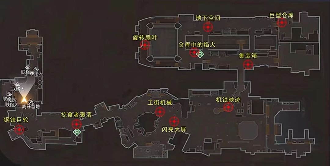 钢铁巨轮:-1772,3857 掠食者聚落:-1712,3850 闪亮大屏:-1608,3849 工街机械:-1624,3839 巨型仓库:-1497,3744 仓库中的焰火:-1588,3775 旋转扇叶:-1642,3767 集装箱:-1532,3787 地下空间:-1574,3749 机铁映迹:-1552,3822