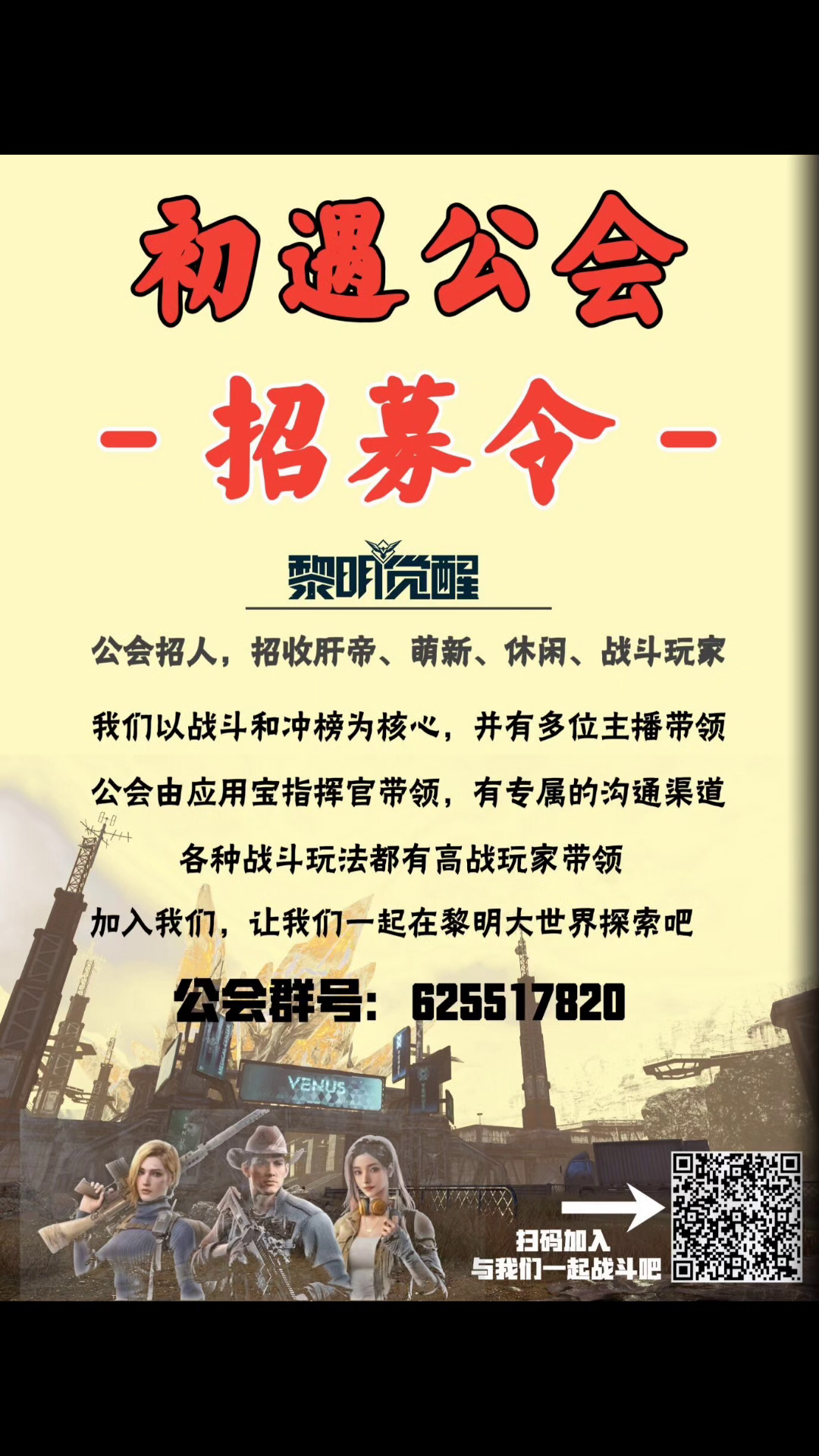 初遇公会招人,招收肝帝、萌新、休闲、战斗各种休闲战斗类型的玩家。公会也是以战斗和冲榜为核心,欢迎各位喜欢打架的玩家加入,公会备有打手和指挥而且会有专属的沟通渠道。休闲喜欢日程和各种支线任务的玩家也大力欢迎。有内测玩家和内测大佬指导带本,在末日世界中玩出自己的乐趣,公会气氛和谐温馨,让大家感受到家的氛围。航天、训练赛和辐射岛各种类型的PVP和PVE模式都有指挥和高战玩家带领获取奖励锻炼技术,并且有多位主播带领冲榜和辐射岛战役。加入我们给你们家的感觉~让我们一起在末日生存的环境下体验到家的和谐和温馨。