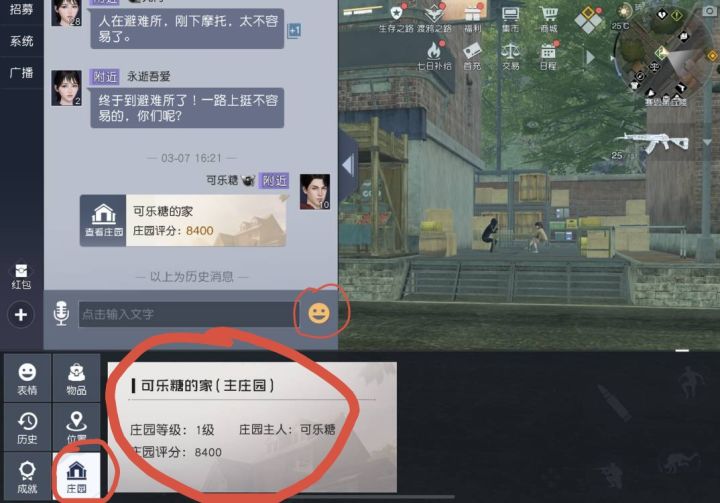 幸存者肯定遇到过在野外收集物资背包满了,着急回家还在到处寻找路牌回去的情况。现在教大家一种原地快速回家的方法,可以为大家节省很多时间1.首先打开聊天框2.选择附近3.如图一,点击表情4.选择庄园,并发送邀请函5.打开自己发送的邀请函,并点击拜访庄园好啦,就是这么简单,希望这个小技巧能对大家有用#黎明觉醒图文创作大赛#游戏安利#游戏推荐#游戏资讯#攻略#游戏讨论