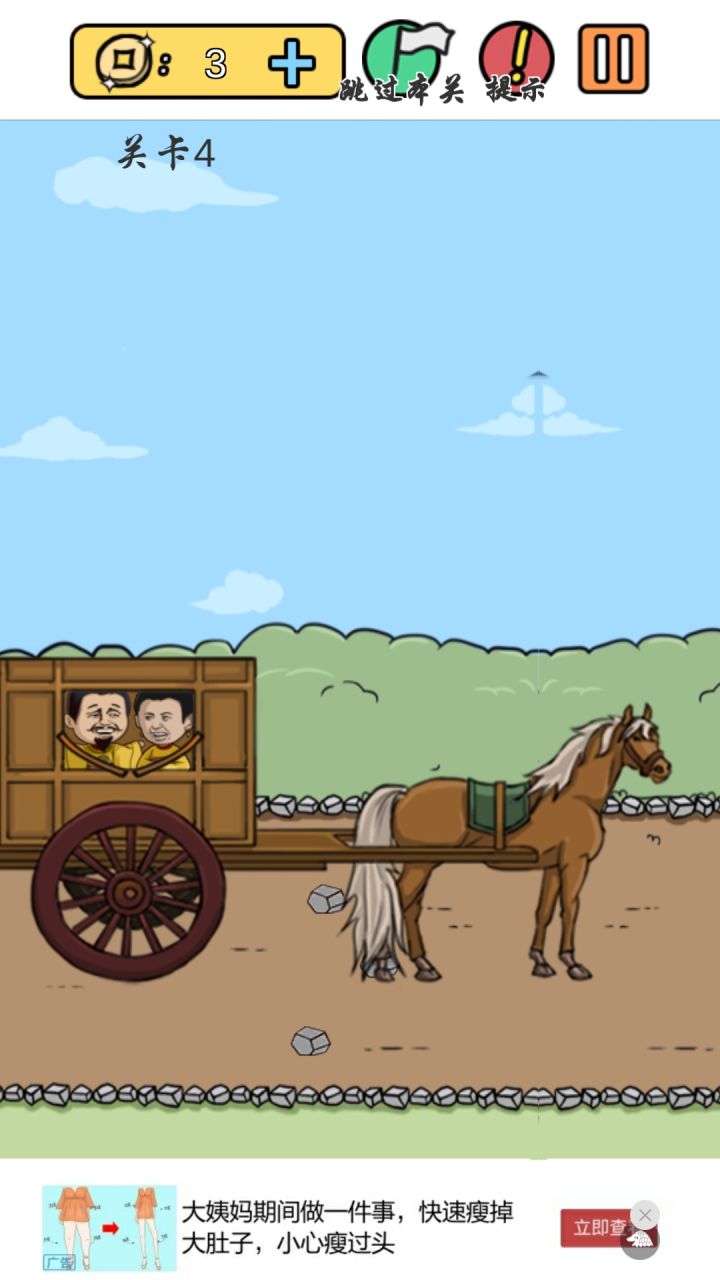 第一关,往右划右半张照片,让他们分开第二关,快一点儿点屏幕,让皇帝走远,就会因为不拎东西分手啦第三关,把皇帝手里的玫瑰花送给那个最好看的小姐姐,半月就会生气分手第四关,点一下半月那边那个木头,就那个斜杠,半月就会被马车颠出去,点皇帝的也一样第五关,点空中飞的那个鸟,让鸟屎掉在他们两个中间,皇帝会躲开。(但是掉皇帝头上,皇帝躲都不躲)第六关,点一下屏幕上那个开始按钮,会出现下面这个图,点好