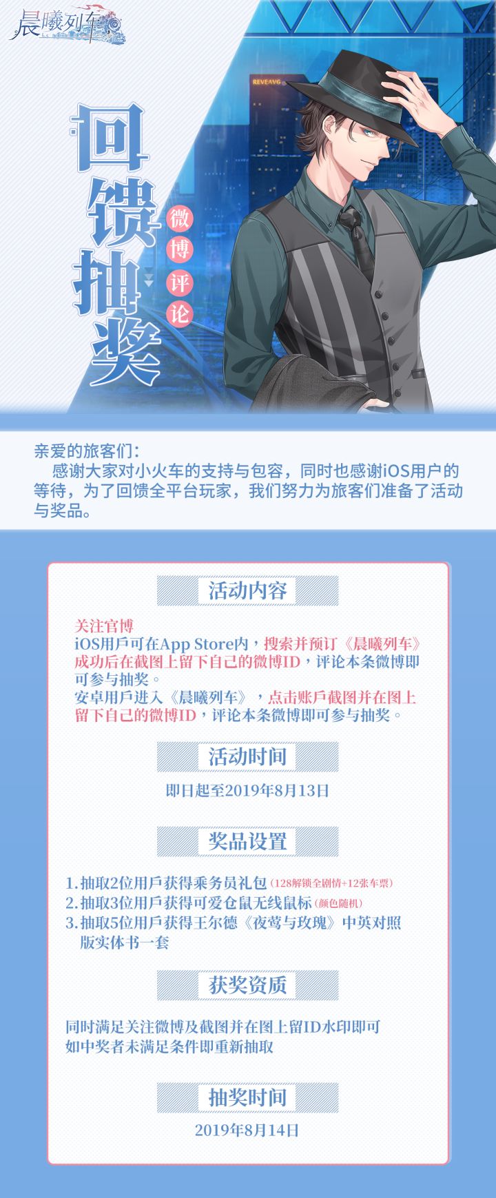 亲爱的旅客中午好~!现播报一则重要通知。8月13日10点苹果商店即将正式开启《晨曦列车》iOS版本!目前您已经可以预定APP。安卓版本用户将需要在8月13日10点同时更新客户端.【安卓端将于8月13日早9:00—10:00进行维护,维护时间为1小时】※本次维护后需要重新下载客户端。※更新后双端将同步用户资料与全部版本功能。※根据实际情况,有可能提前或延后开启服。预约地址:http: