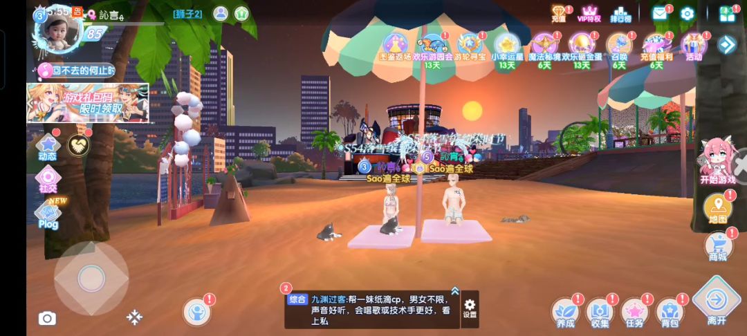 #游戏日常 ,夕阳下沙滩上撑伞铺垫练瑜伽,妻为友猫为师同步动作显恩爱,靓仔伴侣今生聚会,訫言ﻬ老婆,我爱你!