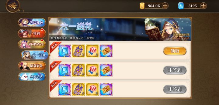 为了让各位勇者大人周末玩的更开心,我们带着周末福利来啦只需要每天登陆游戏,即可领取下面这些奖励哦,祝勇者大人们周末愉快!