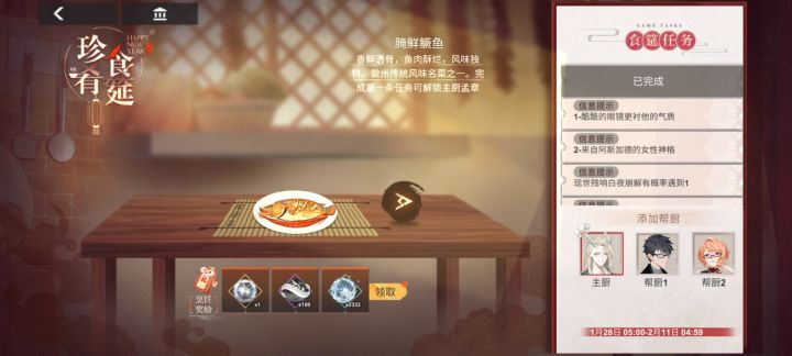 ★珍肴食筵★帮厨信息—— 更新至2.06【清炖蟹粉狮子头】假期就要结束了呜呜呜呜【腌鲜鳜鱼】现世残响-白夜——浮士德咻咻的宝藏——瓦尔基里【东坡肉】炼成复刻——木花时之痕——贝斯特【剁椒鱼头】饕餮再临——托尔惩罚者再临——忒弥斯【饺子】计都再临——月读阿波菲斯再临——计都【年糕】天书再临——源氏现世残响-寂灭——伊南娜【佛跳墙】现世残响-黑暗金字塔——赛特现