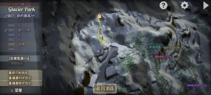 区别传统的关卡式游戏,游戏采用了开放的游戏模式,玩家可以在硕大的雪山中自由滑行,发现作者团队隐藏的各类道具,同时地图融入了滑雪特色,一个个关联起来的缆车能帮助玩家快速到达高点,完成一个个挑战,完成关卡后会解锁更多特色各异的雪山,场景中也有许多其他滑雪人与铲雪机等增添气氛