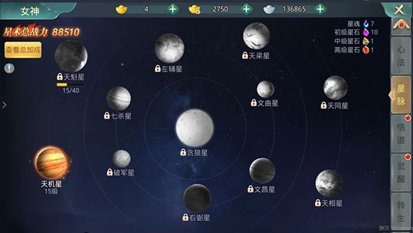一、入口以及开启条件等级≥90开放,打开女神系统即可看到星术系统啦~二、星术1、星术共12个(待定),包括天机星、天魁星、天同星、天相星、天梁星、左辅星、文曲星、文昌星、右弼星、破军星、七杀星、贪狼星;2、初始星术,天机星在星术功能开启时,默认解锁;3、后续星脉需要前置星脉达到一定星级解锁(现40级),并且消耗相应品质的星术石(新增材料)解锁。三、星术升级1、已经解锁的星脉可以升级,