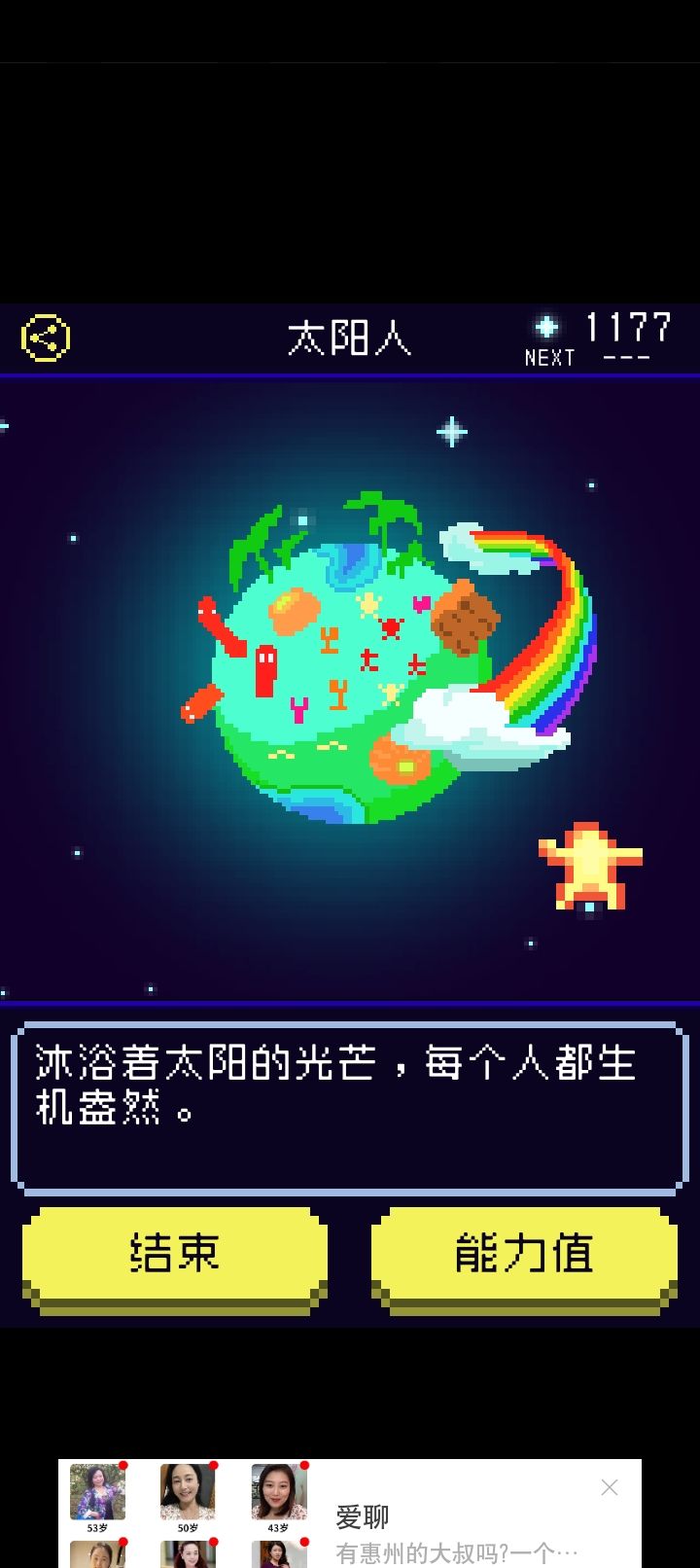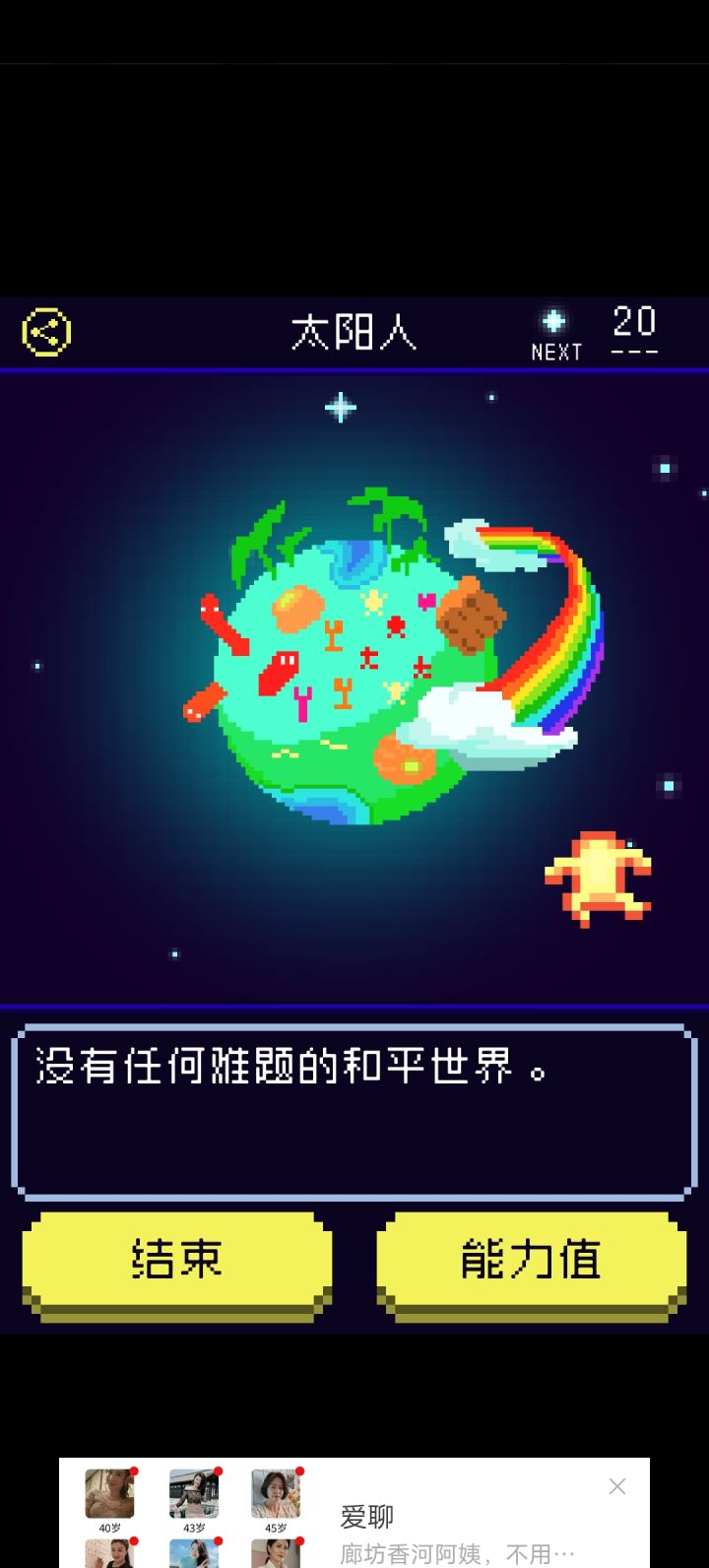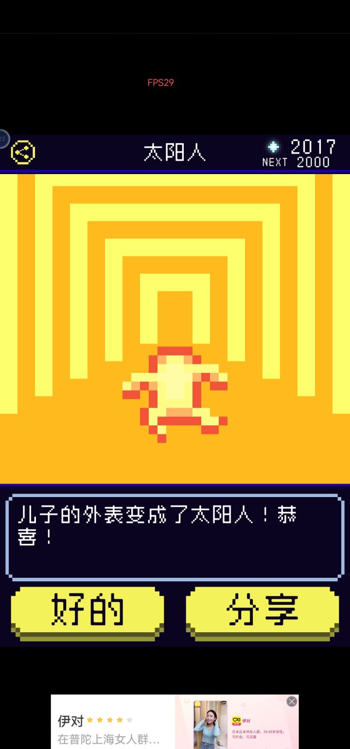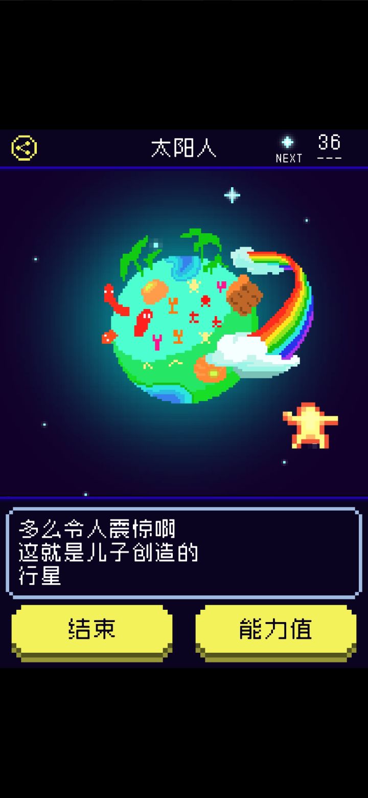 ②剧情:★★★★ 养成儿子的过程好治愈,不同的形态下的儿子在不同场景点击出来的互动也是不一样的。在神社场景的“想往里面丢香火钱明明自己就是神之子”真的好可爱,还有比如说阿胜儿子就是一直元气满满“对你露出满面笑容”之类的,吉米儿子就会讲“一个人好寂寞”这样的话,藤壶儿子是“顽固地封闭着自我”“想剥下儿子的壳可是太硬了剥不开”,不过一直不变的是儿子都会说“画中你和儿子手牵手”“好像希望你再摸摸他”之类的撒娇的话,老母亲瞬间代入感满满!故事的背景在乌鸦的给的提示里也慢慢清晰了(就是不知道为啥刷不出第十七条提示qwq)。虽然我第一次打出来的就是太阳人结局(标准结局的星球太美了)但是把其他线刷出来以后我发现主角都会说“多么令人震惊啊,这就是儿子所创造的星球”,这才是真正的老父亲吧...狠狠地感动了。还要夸一个就是刷其他不同结局的时候发现进化的数值要求都会降低👍👍