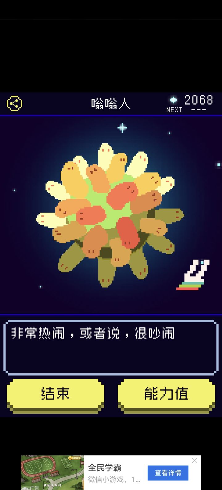 第一次结局是太阳人,很高兴。第二次我想要试一下故意把所有数值保持在最低,但是打着打着就感觉很愧疚,特别是最后一段时间收集亮晶晶的时候,不小心点到吉米,看见它这副模样感觉它好难过啊。良心隐隐作痛。#单机游戏
