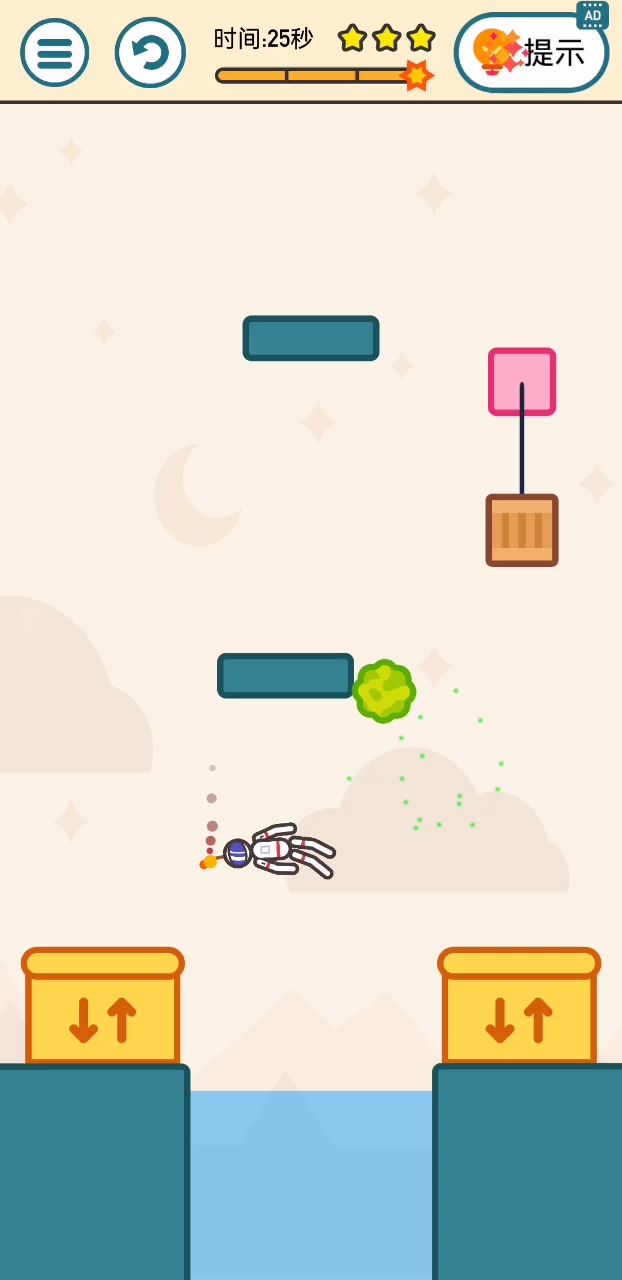 先点掉下方随便一侧方块 让挡板先掉入水中,在点击让火花侠掉入水里