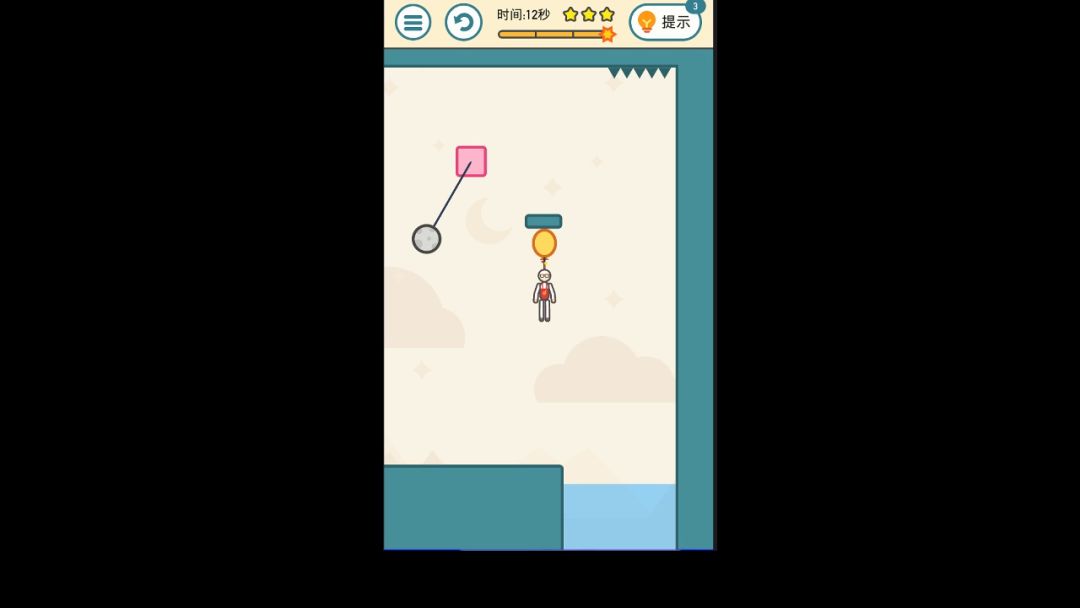 点掉右侧方块 让铁球沿着右侧掉到弹力板上,反弹回去把火花侠撞击至左上方尖刺处,尖刺刺破气球火花侠掉入水中。