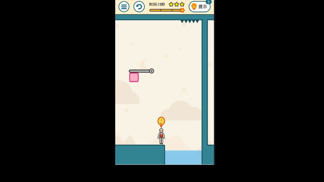当气球上升到一定位置放开挡板,让挡板吧火花侠拨往右上角的尖刺,尖刺刺破气球火花侠掉入水中