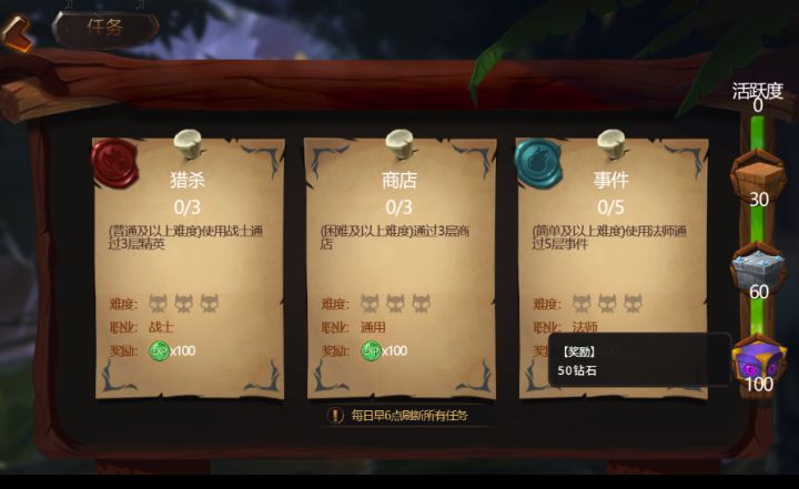 大家好:之前在开发进度报告中我们有过剧透,除了在努力优化性能和体验之外,我们也正在开发新的功能,其中之一就是任务玩法,也是为了玩家能在主线之外增加一些平时没事可以刷刷的东西。任务玩法界面:总得来说,任务玩法要达成还是比较简单,但是奖励是非常丰厚的,可以得到经验和钻石,经验可以解锁装备卡槽、升级血条,钻石更是大有用处。在之前的测试中,我们的游戏整体还比较简陋,主要是为了验证核心玩法,角色和内