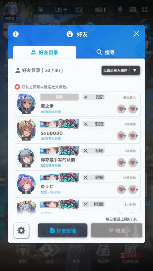 七月初建的号 刚玩那会 剑星池百来抽都没抽出联动角色 但抽出了吸引我玩这游戏的米哈拉 开局就靠米哈拉和舒格推图挺难受的 后边抽到个哈兰才玩得轻松些 那段时间基本都泡在这游戏里 看到自己肝后也只比有一堆朝圣的同服务器的一个玩家领先一点时我挺郁闷的 因为企业塔领先两座 其他和第二齐平 后边为了拿框 每次齐平的快到首达时 都是刷新前上线等刷新直接拿 于我挺奇怪的 刚玩那会拿个