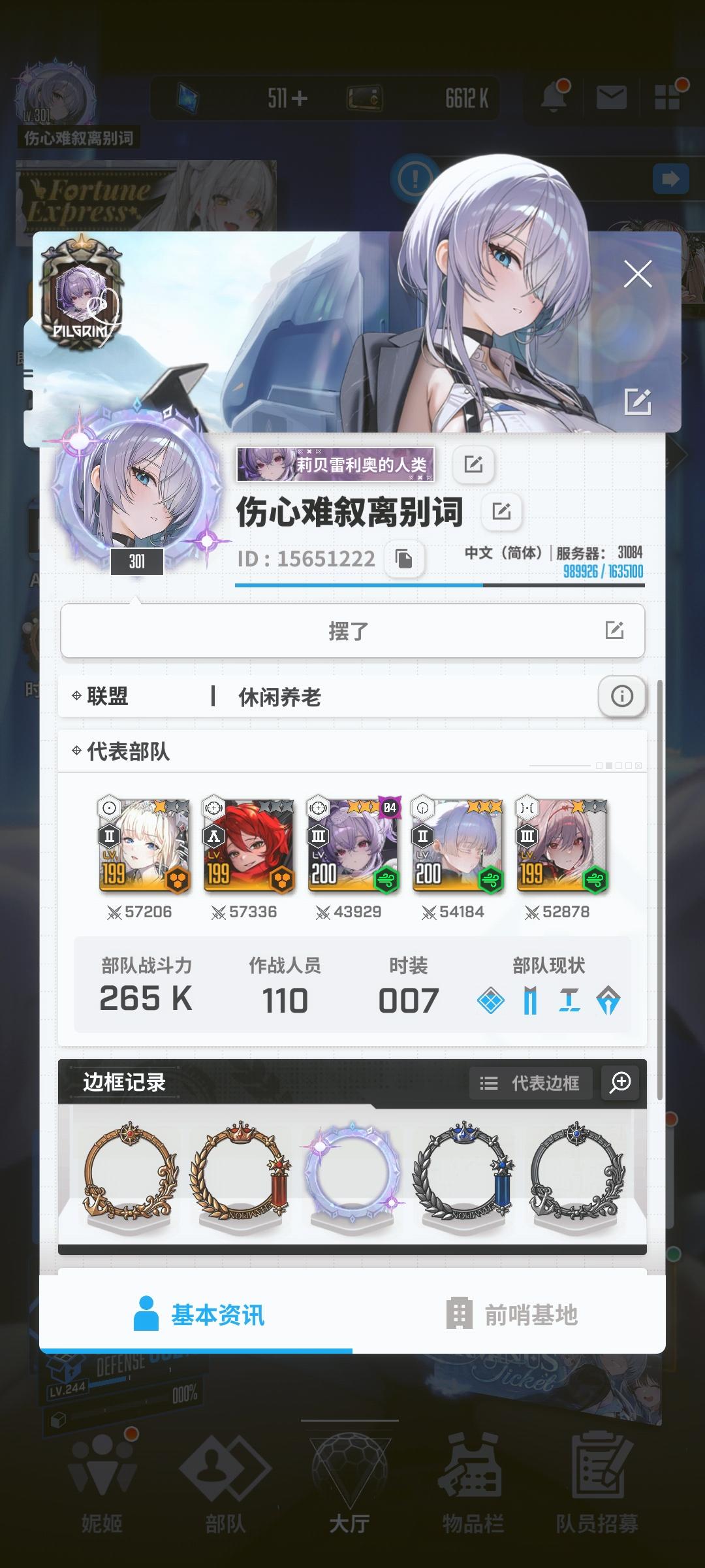 七月初建的号 刚玩那会 剑星池百来抽都没抽出联动角色 但抽出了吸引我玩这游戏的米哈拉 开局就靠米哈拉和舒格推图挺难受的 后边抽到个哈兰才玩得轻松些 那段时间基本都泡在这游戏里 看到自己肝后也只比有一堆朝圣的同服务器的一个玩家领先一点时我挺郁闷的 因为企业塔领先两座 其他和第二齐平 后边为了拿框 每次齐平的快到首达时 都是刷新前上线等刷新直接拿 于我挺奇怪的 刚玩那会拿个