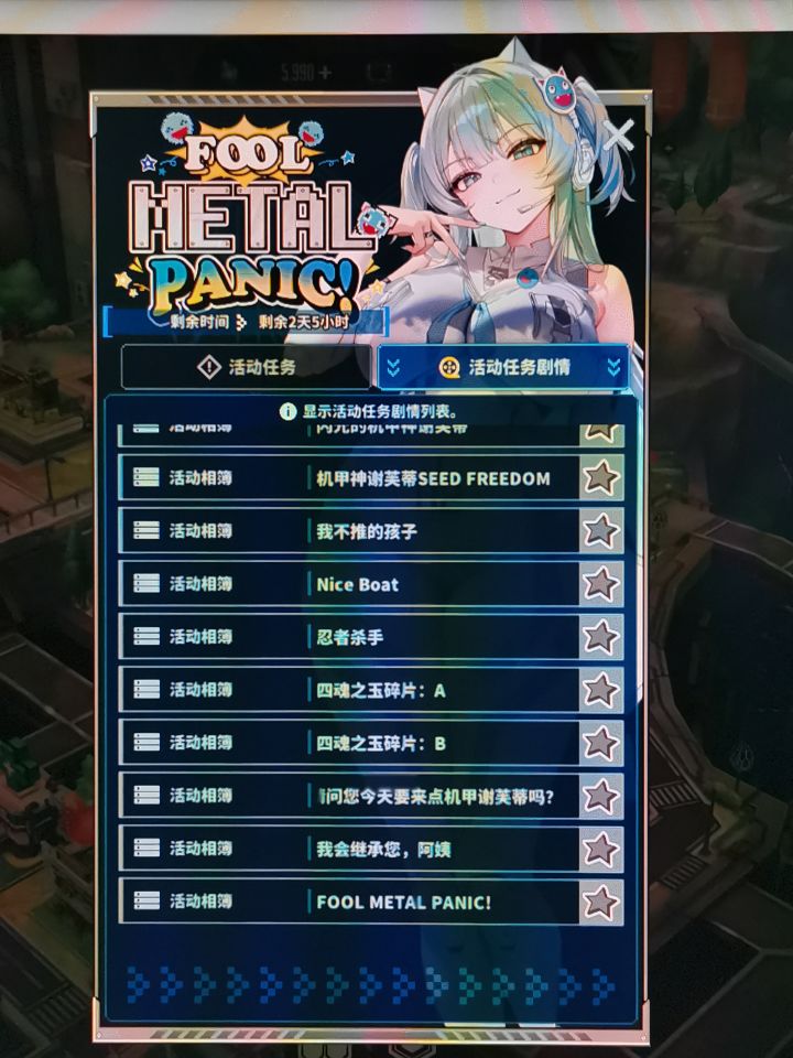 基地等级卡在530左右好久,一气之下金票换了牡丹开珍藏品,用牡丹神力终于是让我这个手残过了,一个月之内不想再凹困难了,开睡!(主要是镜像目前这个战力不可能过得去)中间感谢某佬帮忙过了几个粪关,真的佩服这些越战快百分之五十凹图的手操佬。最近版本实在无聊,不怎么打开论坛,往上翻才发现某最活跃的蓝色头像突然退游,怪不得如此冷清。也不知道自己还能玩多久,但作为零氪党目前的钻票也都够用,同步器就随缘了,