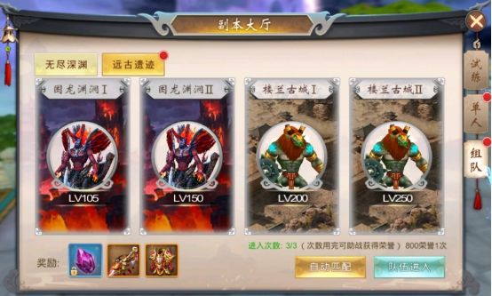 游戏中,装备提升战力和属性是十分重要的,挑战更厉害的BOSS、PK等也需要装备进行支撑,那么如何快速升级呢?下面就为大家介绍一个可以飞速获取装备的玩法副本——远古遗迹。【开启条件】玩家达到105级开启,进入方法:点击右上角副本-组队,就可以找到远古遗迹,副本可以单人或组队进入挑战,如战力不够的玩家,可以找大腿噢!【玩法介绍】1、远古遗迹每天可以进入3次,次数用完也可以继续挑战,每次获得80