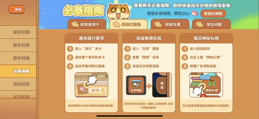 前期建议先换车票,因为旅行关卡每一关首次通过都能获得5个红鱼,相比于直接换红鱼,还能获得额外的食材和鱼干,旅行期间还可以遇到其他剧情送的猫猫。依靠前期送的猫猫和零星抽到的猫咪,可以快速度过前期。到达第10章左右,可以开始兑换小红鱼。因为旅行关是有限的,后期打一次需要7张8张车票,全部过完就不能获得首过奖励的5个红鱼了,所以当获得一定的剧情猫猫后就要开始转换思路和方向。