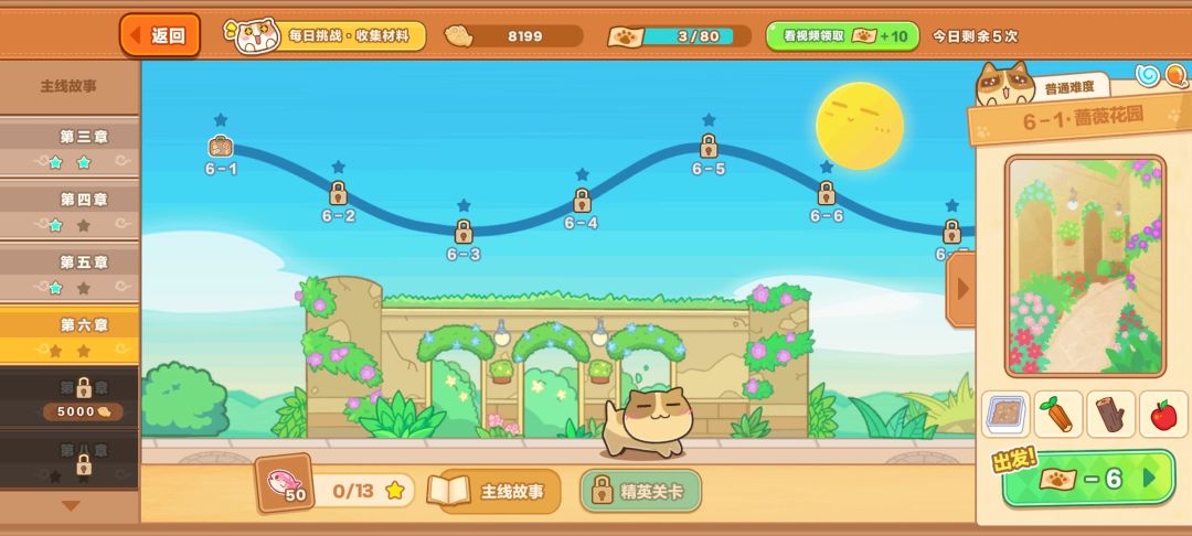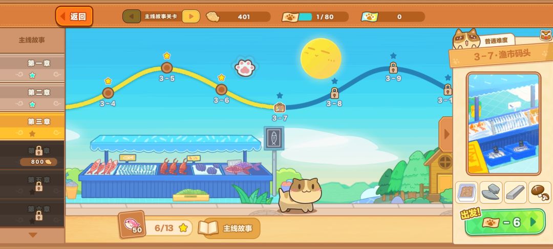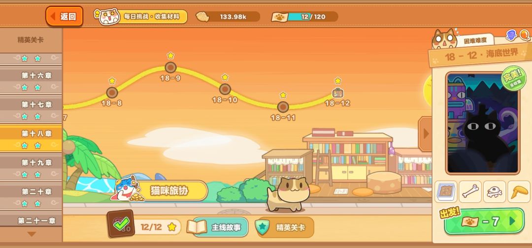 冲关到第10章左右,需要放缓主线推进速度,开始打每日挑战关卡获取农场材料。将农场推进到能生产第二档菜品并且能三只猫猫轮换。前期站台需要5只猫猫,农场轮换的4个区域猫猫前期一只能工作一个半小时,那么总数要达到24/1.5*4+5=69只猫猫,才能保证生产的基本运转。