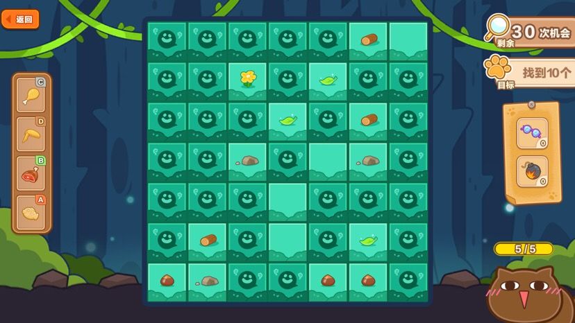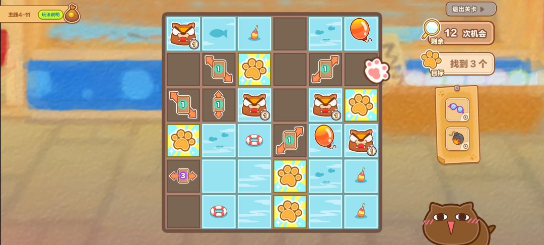 1方向 例如下面这张图 我们可以看见一个绿色箭头指向草丛 这个相信大家都知道,只要点指向的格子必定会有猫爪! 2指向look观察下面这张图 你能得到什么信息? 是的没错!我们翻开了第一行的第一个格子这个牌说明了什么?说明了这一竖排会有一个猫爪但你如果一个一个去点的话,有可能撞大运一个就点到但如果你运气很背的话就会损失三个机会,那怎么避免这样情况呀?如果你的探索次数很多的话,可以在点点旁边的几个牌子