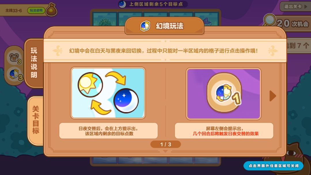 幻境玩法是3.31更新的新玩法,总结了一些经验,希望帮助到大家。 1.玩法说明: ①幻境中会出现白天与黑夜来回切换,过程中只能对一半区域内的格子进行点击操作哦! ②格子上方会提示未被蒙住的区域剩余几个目标点 ③日夜交替:进入关卡,一半的格子被类似于雾的东西蒙上,被蒙上的部分将不能点击格子。几个回合后,雾将蒙上另一半格子,来回交替。 2.进阶版: ①在下图中:上方提示 “左侧区域剩余0个目标点”