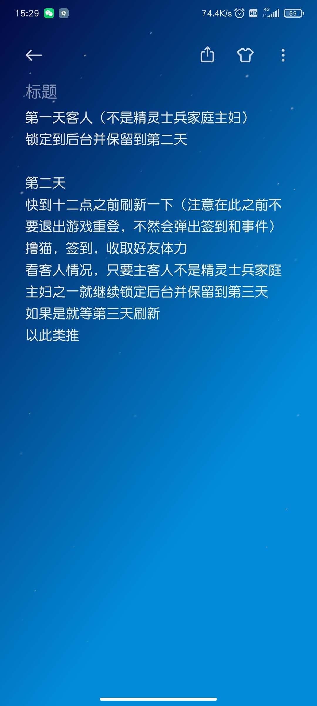 看到很多人被这三个客人所困扰,就分享一个小技巧 因为游戏现在刚出不久所以有很多机制都不完善。 包括每天的签到自动更新,所以可以利用这个机制尽可能的卡客人。 具体操作就是在凌晨十二点之前将游戏挂在后台并锁定住,这样第二天你的客人还是昨天的客人。 然后在快到凌晨十二点之前,比如十一点或者更早可以重新登陆刷新一下,看客人情况,如果好继续锁定卡住,如果不好也没关系,很快就到新的一天可以再刷新一波。 因为来