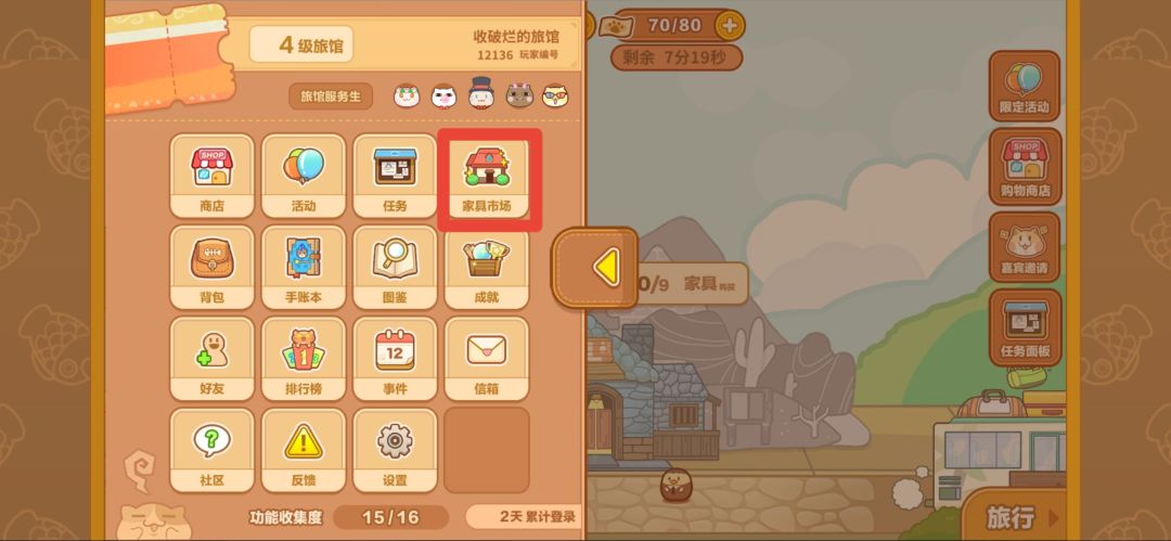 翻了一下发现没人写新手攻略区,简单的写一下帮助各位适应阶段 常见问题: 家具装扮在哪里? 点开左侧黄色箭头,找到家具市场。切换到当前旅馆级别即可调整装扮 抽奖券在哪用? 点开右侧嘉宾邀请,即可使用抽奖券。无抽奖券时会消耗金枪鱼。车站票为体力,通关消耗。 农场库存怎么计算? 每只猫咪可采集两小时,采集完后会进入休息,当日不可再选取。农场会随等级增加可采集量。(点击左侧炉子图标可直接进入炼金库领取菜品) 宝箱以及通关要点 宝箱停在黄色区域可以一次打开,停在橙色区域需要两次打开。当翻牌为下图数字4时,代表一横排中有四个目标(目标地方不确定,只能确定数量)。当翻牌为下图数字2时,代表一个斜排有两个目标。当步数用完时可以看广告增加2个步数,每关限看3次。