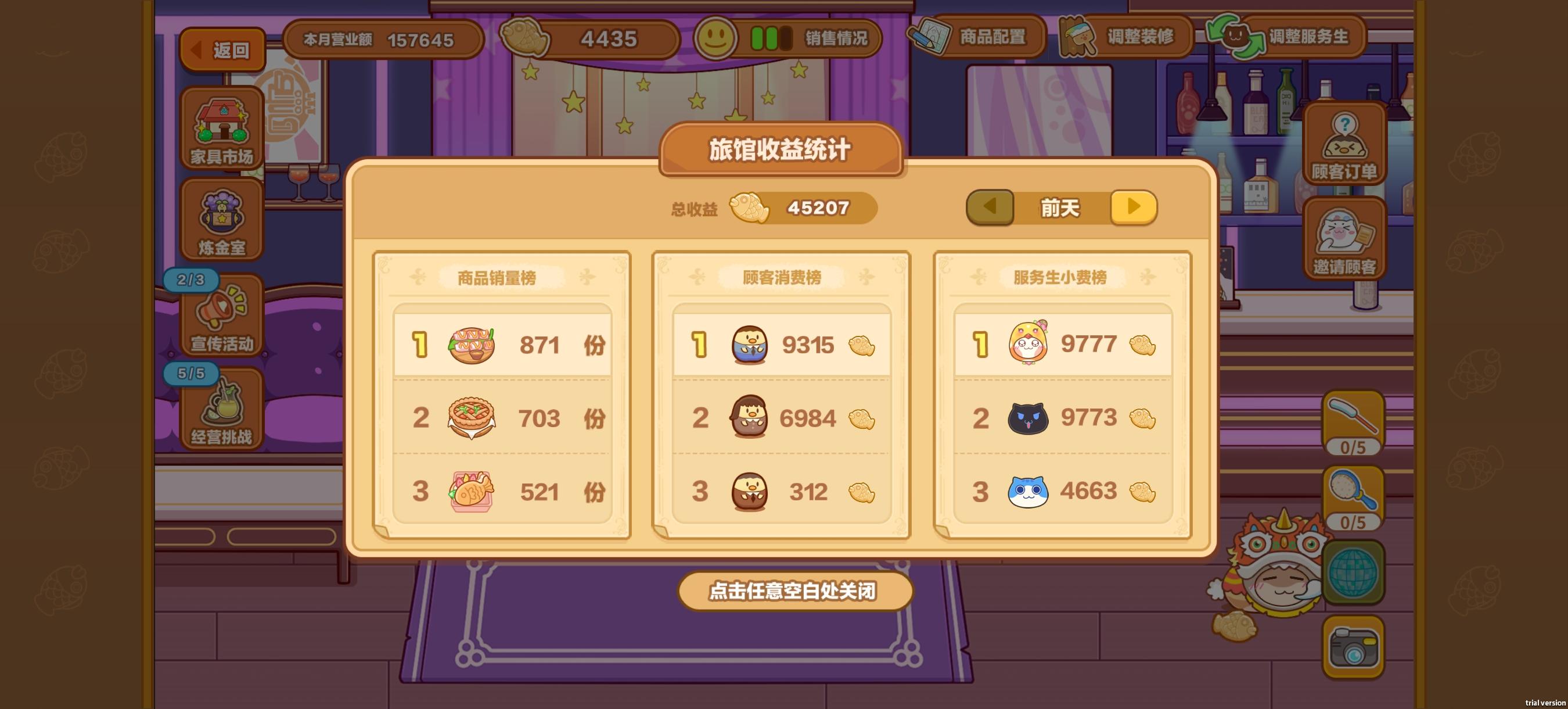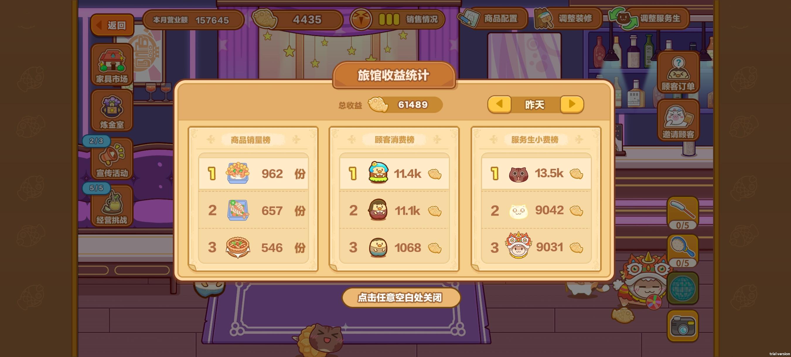 手机编辑,简要写一下新入坑的问题版本功能全解锁要6级!温泉(好感度)和公会(换,卷,红鱼,体力)1 旅店收益分为小费和经营经营部分主要是升d级菜谱,开农场和探险获取原材料,前期材料不够卖的,收入小费还是很重要的小费部分需要满足当需要属性的服务员猫猫才可以获得小费,跟旅店等级挂钩,但过高等级属性要求会变高,所以先6级解锁全部功能,然后提升猫咪好感度属性再考虑升级(已经升上去天天满足不了
