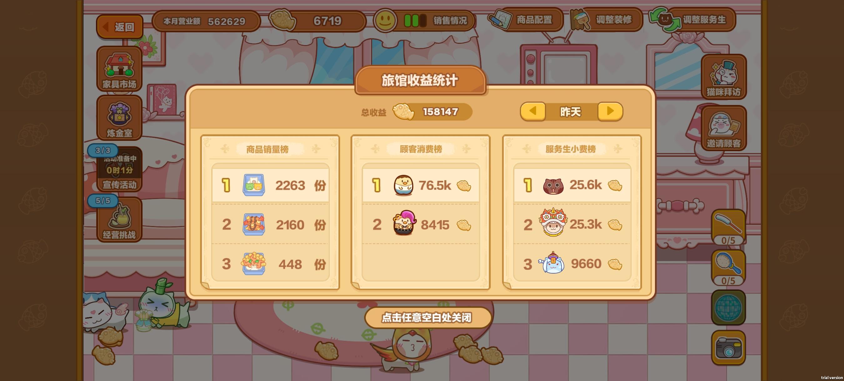 第七天上了80名,把库存清差不多了→_→然后小费机制,首先升一级掉的是加一块,表内看确实是超过所需属性越多给的挂机小费越多(不明机制),然后就是邀请客人的等级越高,他要的属性越高,所以只邀请d.级客人就好,如果次客拼到a级,挂机小费就会因属性超过不够高而掉一大截公会的便当前期一定要买满提升服务生猫猫