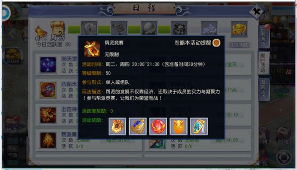 【帮派竞赛】开启条件:服务器等级≥45级,所在区服2级规模以上,健康度60或以上的帮派数量≥4参与条件:人物等级≥50级,入帮2天以上可参加活动时间:周二和周四20:00~21:30胜利条件:帮派积分较高的帮派获胜或者敌方帮派的所有成员都已被清理出场,也能提前获胜行动力说明:1.每一个进入帮战场景内的玩家都会获得行动力,默认为1200点2.每次发起PVP战斗时,都需要消耗行动力,每次